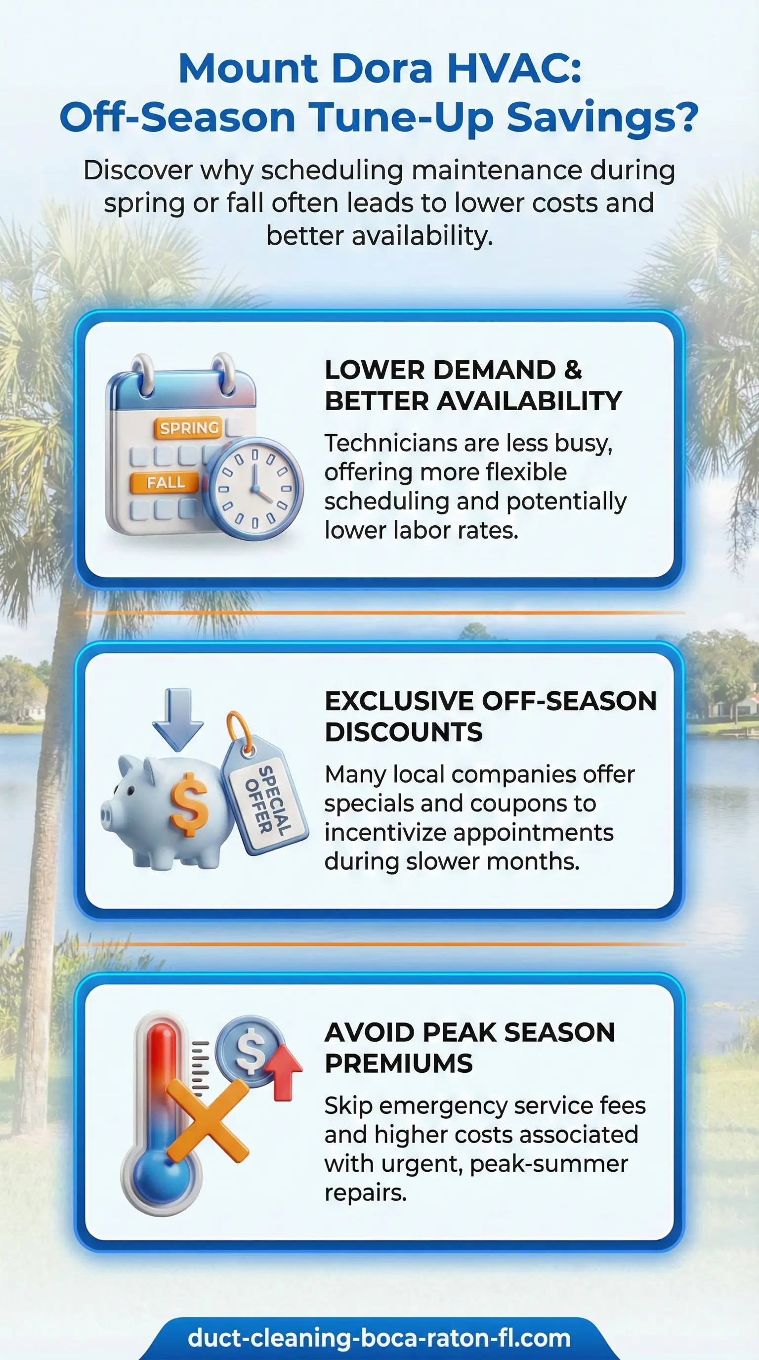 If you're wondering whether timing matters when it comes to HVAC tune-up costs in Mount Dora, our team at Duct Cleaning Boca Raton can tell you from years of experience — it absolutely does. We've seen firsthand how demand drives pricing in Central Florida, and homeowners who schedule their tune-ups during the off-season, typically between late fall and early spring, consistently pay less and get more thorough service. Based on our work across the region, technicians are less rushed during slower months, which means they can spend more time inspecting your system and catching small issues before they become expensive repairs. In this guide, we'll share what we've learned about off-season savings in Mount Dora and how you can make the most of them.