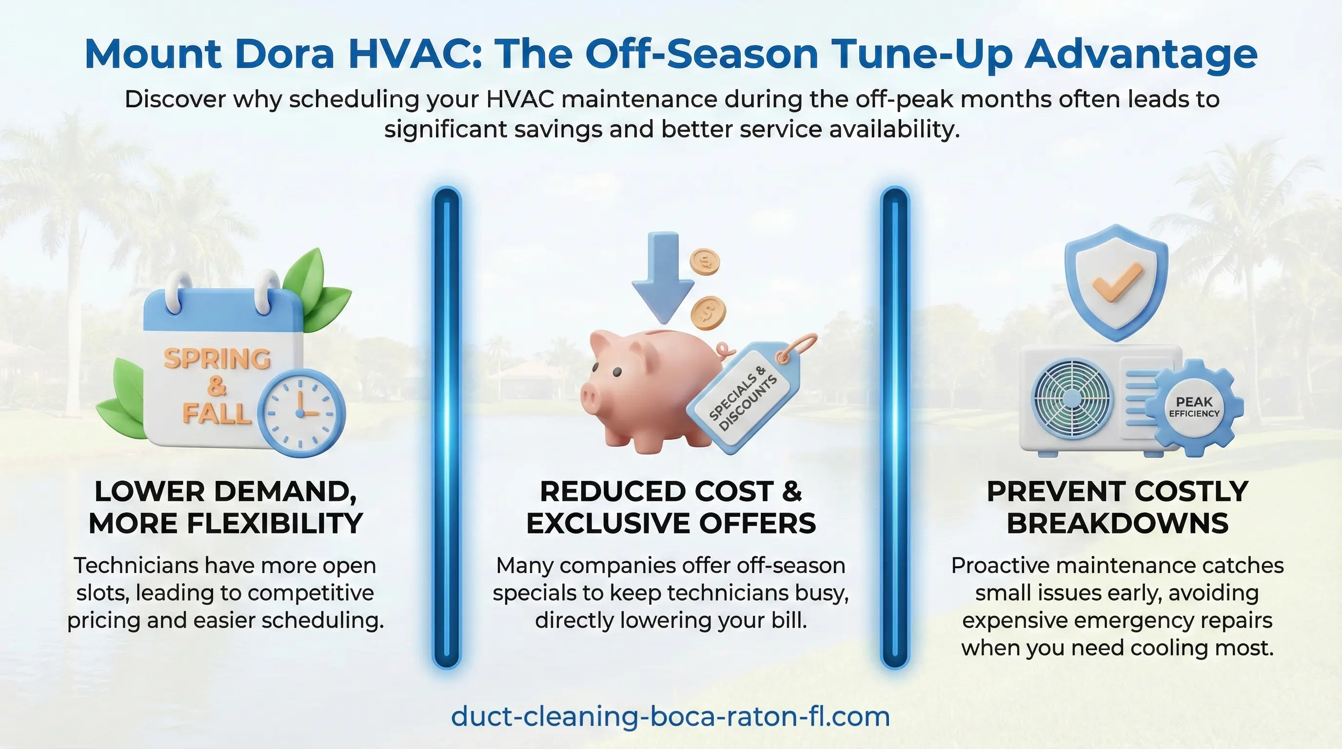 After years of working with homeowners across Central Florida, our team at Duct Cleaning Boca Raton has come to a straightforward conclusion — the off-season is hands down the smartest time to schedule your HVAC tune-up in Mount Dora.